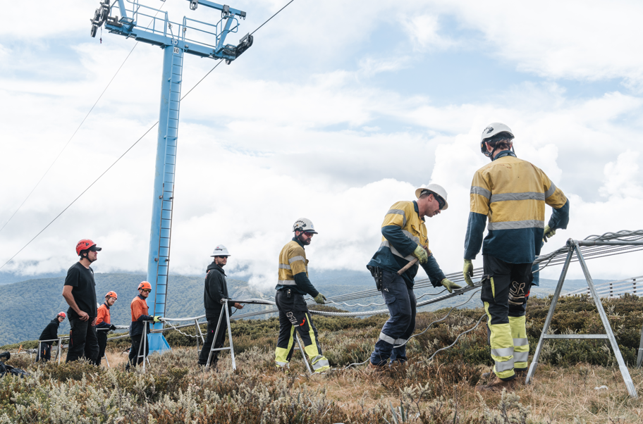 The Falls Creek + Doppelmayr maintenance teams working together to replace the haul rope.